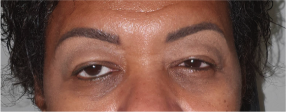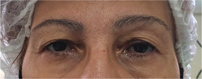 Paciente com excesso de pele nas pálpebras superiores e inferiores.