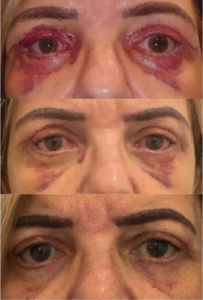 Após a cirurgia, é comum escorrer um pouco de sangue ou líquido rosado de alguns pontos da cicatriz, isso deve parar por volta do terceiro dia. É normal ficar com a pele roxa ao redor dos olhos e inchaço (Figura 3). O inchaço é pior por volta do segundo ou terceiro dia após a cirurgia e é comum o roxo descer em direção às maças do rosto.