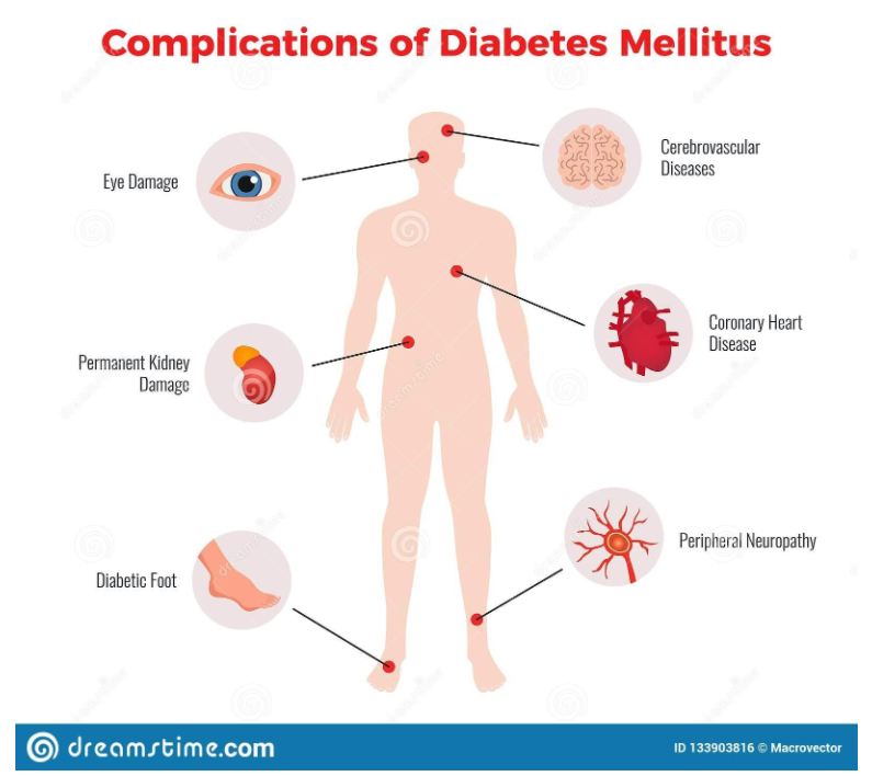 Na diabetes, seu corpo não produz insulina suficiente ou a insulina produzida não atua de forma adequada. Desta forma, há um excesso de glicose no sangue não absorvido pelas células que ficam na corrente sanguínea. Com o tempo, isso afeta a qualidade dos vasos sanguíneos, causando problemas vasculares graves como doenças cardíacas, perda de visão e doenças renais.