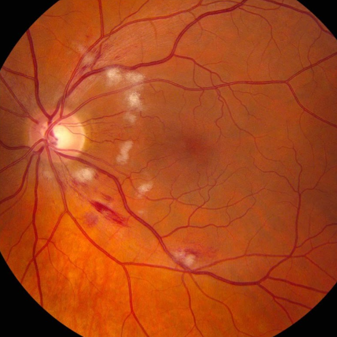 As manchas ou exsudatos algodonosos são lesões de cor branca que aparecem por cima da retina que significam isquemia, ou seja, déficit no suprimento de sangue, nas camadas superficiais retinianas (Figura 4). Também não causam piora da visão e estão relacionadas ao mau controle da pressão arterial.