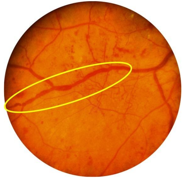 É uma alteração caracterizada pelo aumento e diminuição brusca e repetitiva do calibre das grandes veias da retina, dando o aspecto de um rosário ou de uma corda de linguiças. Isso é resultado do desgaste dos vasos sanguíneos pela diabetes e é também um importante sinal de déficit de suprimento sanguíneo (Figura 8).