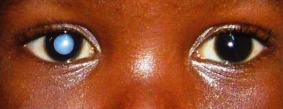 Paciente com reflexo branco (leucocoria) no olho direito por catarata congênita.
