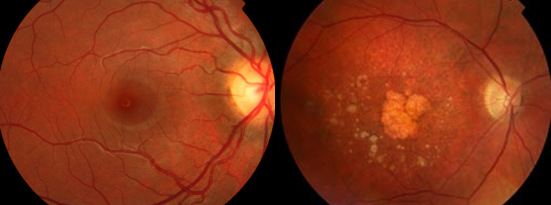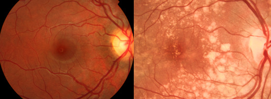 À esquerda uma retina normal e à direita observa-se DMRI na forma seca associado a atrofia (área mais clara) da parte central da mácula.