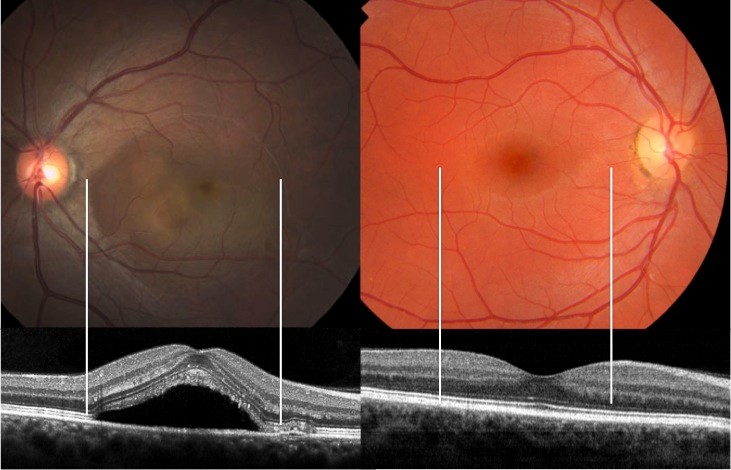 À esquerda observa-se o limite do descolamento da retina na região macular com a imagem da tomografia da retina, e à direita uma retina normal.